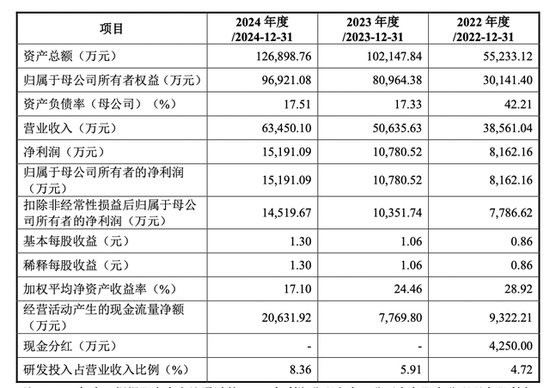 据招股书,2022年-2024年,臻宝科技实现营收分别为3.86亿元、5.06亿元、6.35亿元;归母净利润分别为8162.16万元、1.08亿元、1.52亿元。