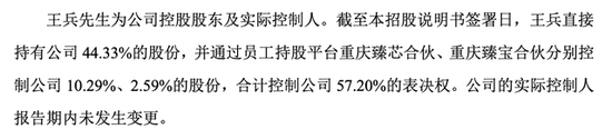 IPO前,公司实际控制人王兵直接持有公司5,162.50万股股份,占公司股本总额的44.33%,并通过重庆臻芯合伙、重庆臻宝合伙控制公司12.88%的股份,合计控制公司57.2%的表决权。