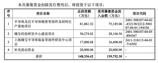 本次IPO,臻宝科技拟募资13.98亿元,用于半导体及泛半导体精密零部件及材料生产基地项目、臻宝科技研发中心建设项目、上海臻宝半导体装备零部件研发中心项目、补充流动资金。