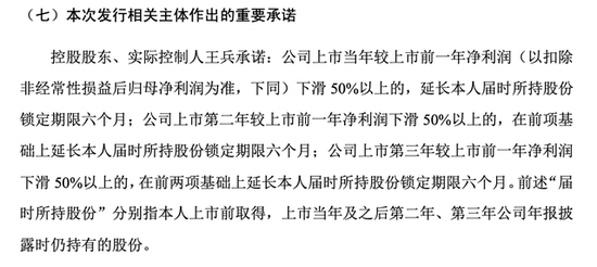 值得一提的是,王兵承诺:公司上市当年较上市前一年净利润下滑50%以上的,延长本人届时所持股份锁定期限六个月;公司上市第二年较上市前一年净利润下滑50%以上的,在前项基础上延长本人届时所持股份锁定期限六个月;公司上市第三年较上市前一年净利润下滑50%以上的,在前两项基础上延长本人届时所持股份锁定期限六个月。