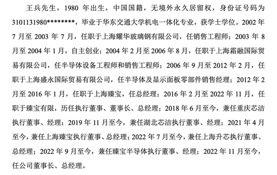 资料显示,王兵,1980年出生,中国国籍,无境外永久居留权,毕业于华东交通大学机电一体化专业,获学士学位。2002年7月至2003年7月,任职于上海耀华玻璃钢有限公司,任销售工程师;2003年8月至2004年1月,自主创业;2004年2月至2006年8月,任职于上海霜融国际贸易有限公司,任半导体设备工程师和销售工程师;2006年9月至2012年2月,任职于上海盛永国际贸易有限公司,任半导体及显示面板零部件销售经理;2012年2月至2016年1月,任职于上海臻宝,任总经理;2016年2月至2022年11月,任职于臻宝有限,历任执行董事、董事长、总经理;2018年6月至今,兼任重庆芯洁执行董事、经理;2019年11月至今,兼任湖北芯洁执行董事、经理;2021年4月至今,兼任上海臻宝执行董事、总经理;2022年7月至今,兼任上海升芯执行董事、总经理;2022年9月至今,兼任臻宝半导体执行董事、经理;2022年11月至今,任公司董事长、总经理。